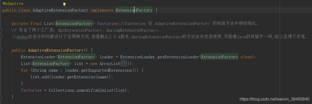 4 执行 AdaptiveExtensionFactory.getExtension()。AdaptiveExtensionFactory 类中有一个集合变量 factories。 factories 在 AdaptiveExtensionFactory 的构造方法中被初始化,包含了两个工厂类:SpiExtensionFactory、SpringExtensionFactory。执行 AdaptiveExtensionFactory 类的 getExtension() 方法会依次调用 SpiExtensionFactory 和 SpringExtensionFactory 类的 getExtension() 方法。