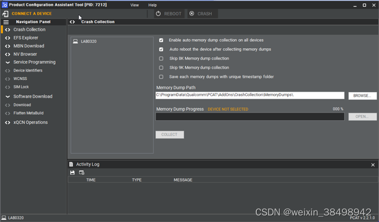PCAT 可用于 RAM 转储收集。 PCAT 的崩溃收集功能允许您从设备下载内存转储。设备崩溃后,设备进入崩溃状态,PCAT 尝试下载内存转储映像。崩溃收集插件在用户界面上显示有以下功能: