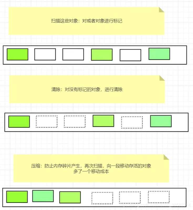 缺点:两次扫描,严重浪费时间,会产生内存碎片(对象存储的时候用hash,找内存也需要时间成本,对象位置很散乱)