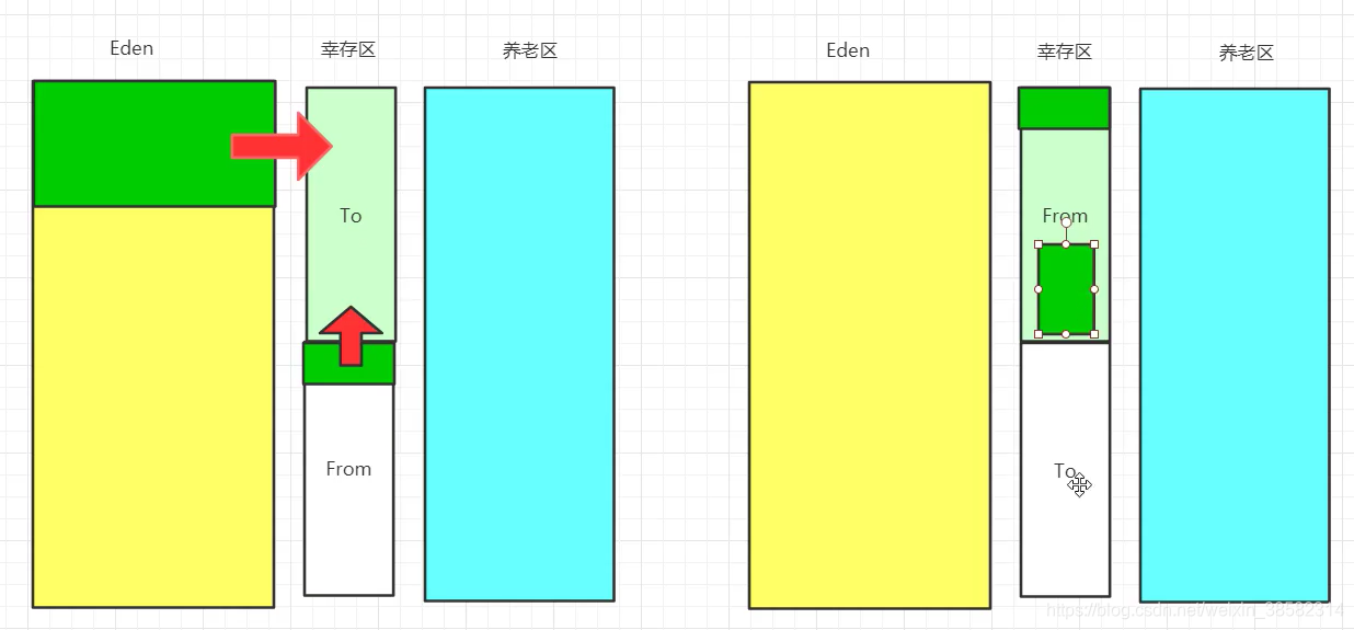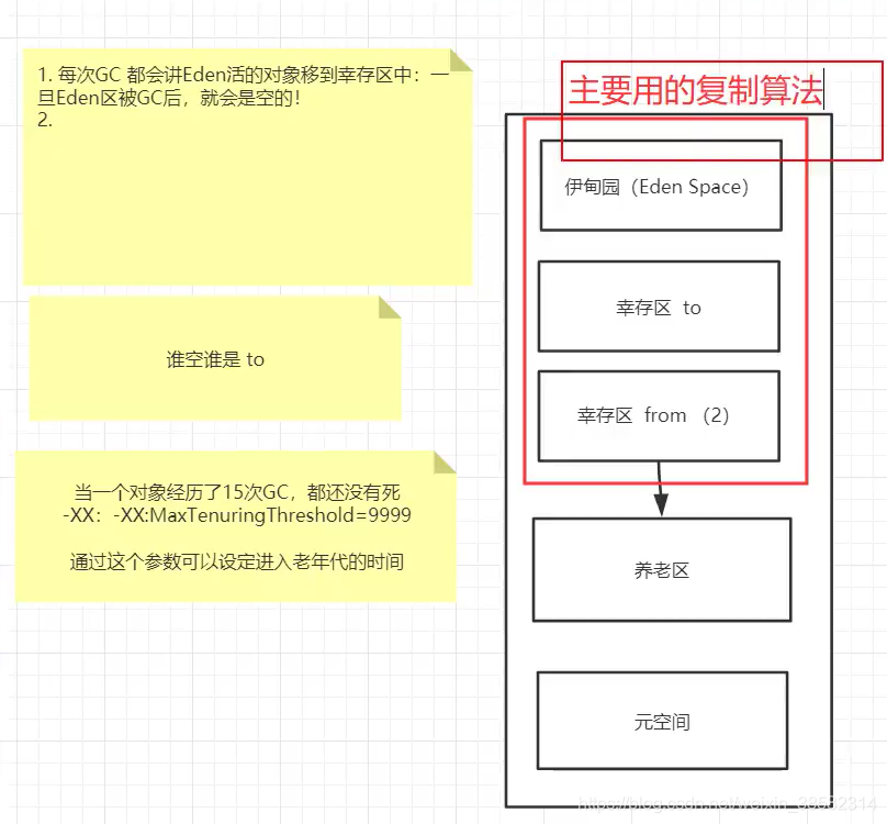 复制算法,空的始终都是to。当幸存0和幸存1区都有一个的话,就把其中一个复制到另一个,这样,有两个对象的就是from,空的就为to。要是把from中的两个复制到to中,那么to就变成了from,from就变成了to。