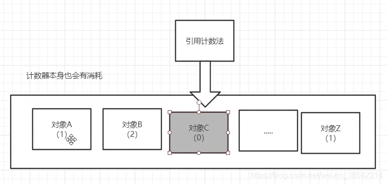 引用计数法,每个对象有被用的次数的统计,当次数为0时,就清除出去了。但是计数器本身也有消耗,并且碰到有些死循环,就会一直计数出不来。现在一般不采用此方法。