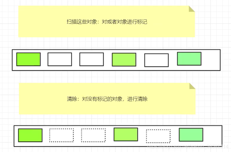 回收垃圾时,扫描这些对象,对活着的对象进行标记。清除的时候,对没标记的清除掉。