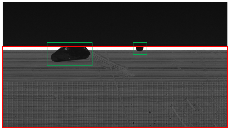 图中绿色框区域为边缘崩缺位置,红色边框是使用外接矩形法,或凸包法检测出来的物体的边缘轮廓。但当检测物体不是规整的形状,且带有弧度时,如图所示,绿色部分为物体的崩缺,此时外接矩形法和凸包法则不能适用于这种场景。