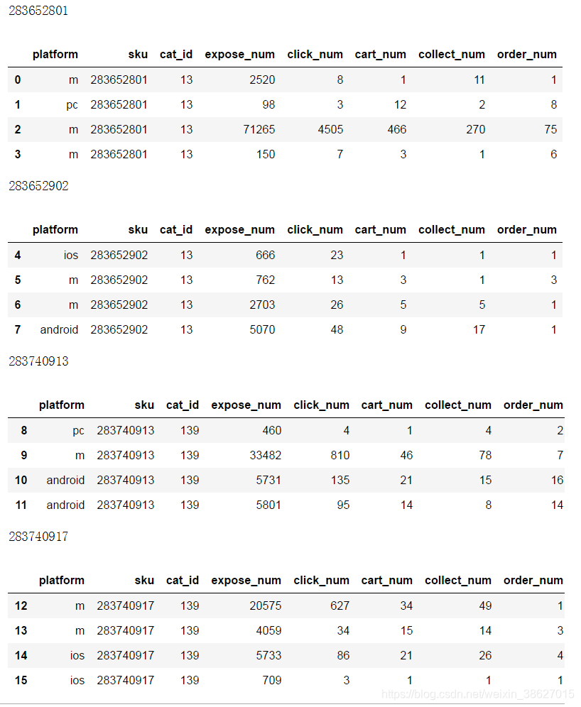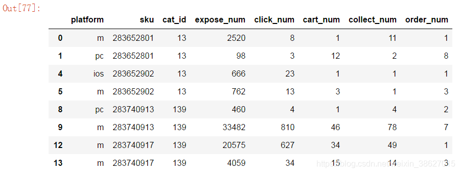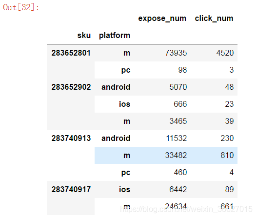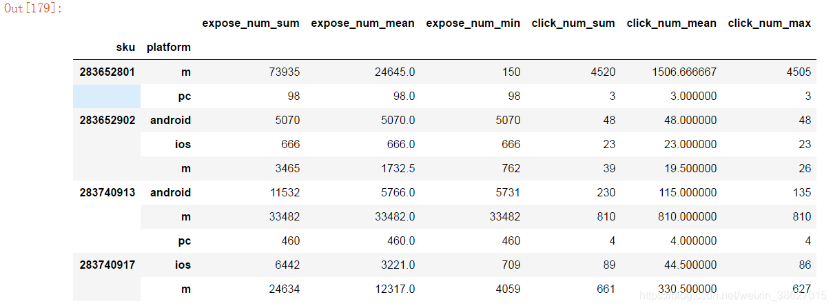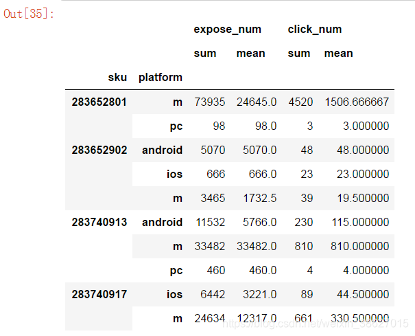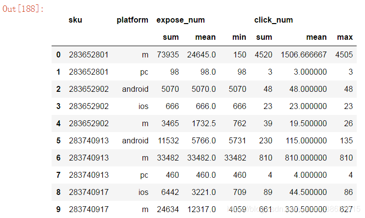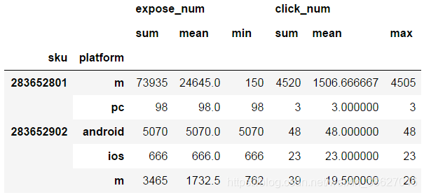 group_obj = df.groupby(['sku', 'platform']).agg({'expose_num':['sum','mean','min'],'click_num':['sum','mean','max']})