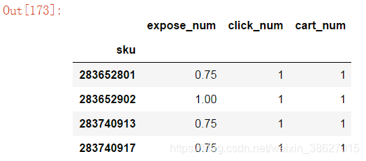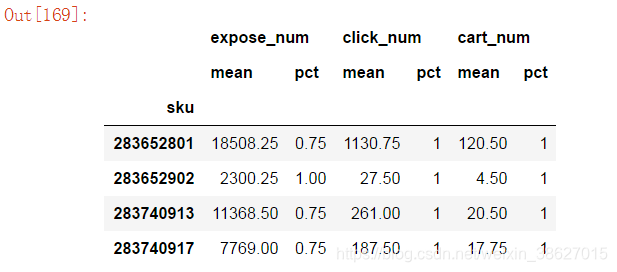 df.groupby('sku')['expose_num','click_num','cart_num'].agg([mean,agg_func(pct_func,'pct',low=0,high=10000)]).round(2).head()