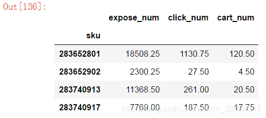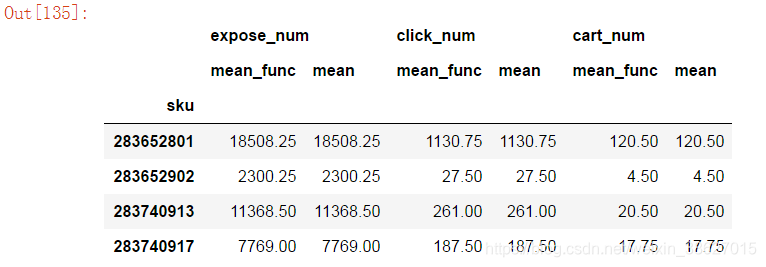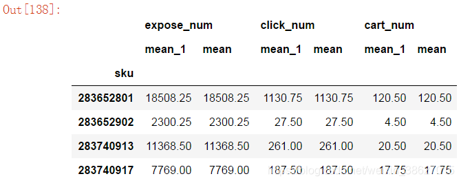 df.groupby('sku')['expose_num','click_num','cart_num'].agg([mean_func,'mean']).round(2).head()