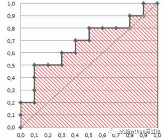 构建起的图形中,曲线右下方的面积即为AUC值,AUC值越大说明模型的效果越好,如图: