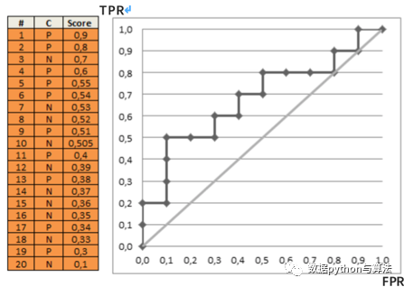 1) 根据模型计算出样本的y值,形成score表,从大到小排序,上图左图中使用20个样本,得到20个score;