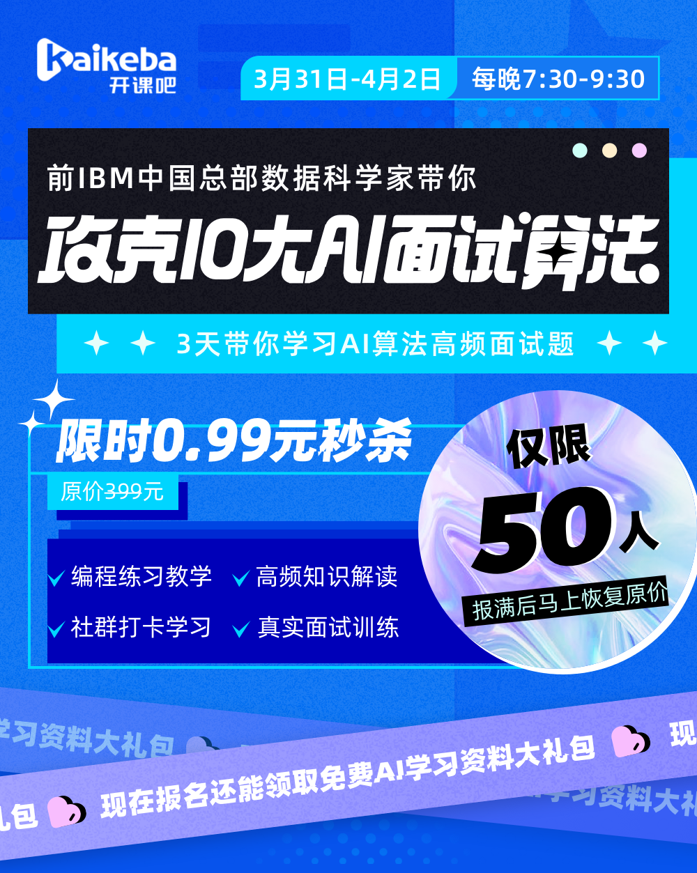 给大家推荐一个训练营,三天让你掌握算法面试内容,高频面试题解读,真实大厂面试考察知识点,理论+编程实战练习题,复现代码真实演练,快速提升面试水平,还能近距离接触面试官!