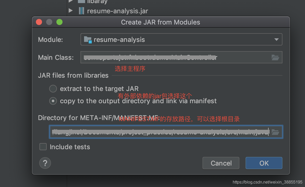 2.配置运行函数入库,MAINFEST.MF的存放路径,对于JAR files from libraries选项,如果程序需要外部依赖jar,选择第二个,否则,选择第一个