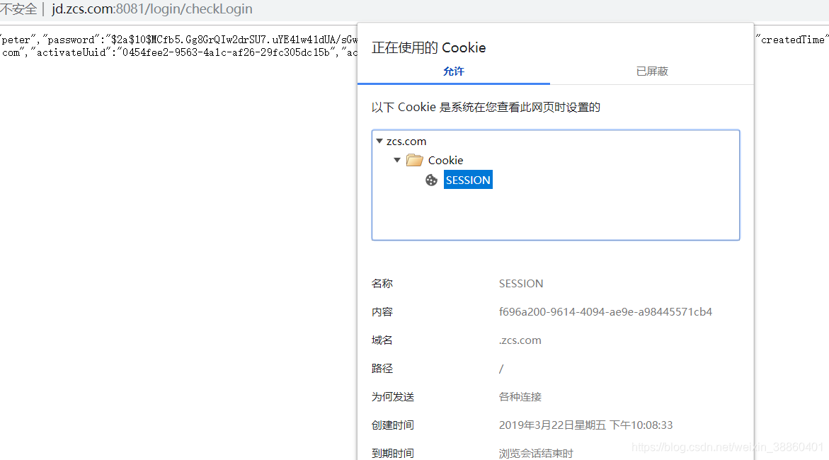 可以看到两个域名下都有cookie,同父域名下cookie的跨域问题就解决了(没有解决跨域问题的话就是你在jd.zcs.com这个域名下登录,跳转到tb.zcs.com这个域名的页面的时候会拿不到用户的cookie,从而拿不到用户的信息)。