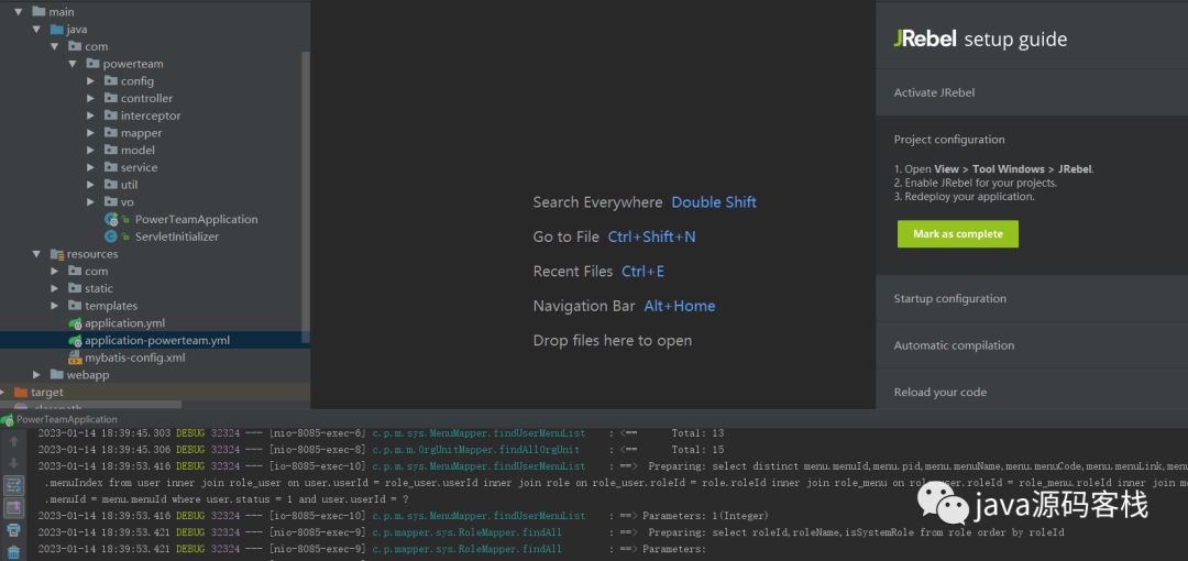 3.java依赖安装完成后,点击IDEA里的Run->PowerTeamApplication模块运行,如果找不到入口模块,可以手动打开以下路径运行文件中的函数: