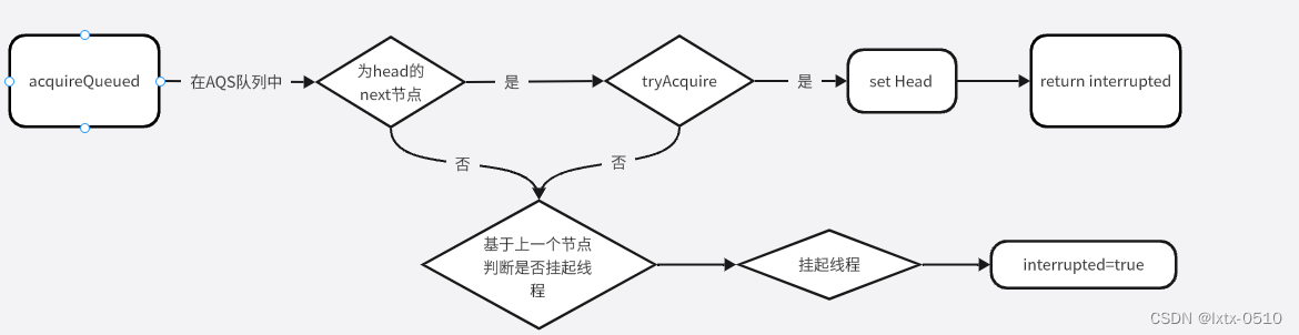 // acquireQueued:查看我是否是第一个排队的节点,如果是可以再次尝试获取锁资源,如果长时间拿不到,挂起线程