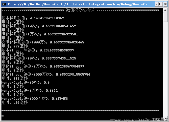 下面对各种积分方法进行测试,对sinx/x在[1,2]区间上进行定积分。其中,我们分别对复化梯形和复化Sinpson法则做分段为10,10000,和10000000的积分测试。另外,对Monte-Carlo法也投点数也分为10,10000,和10000000。测试结果如下: