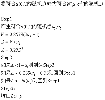 下面我们实现这个算法,这里的X我们仅给出最常用的正态分布,如果要实现其他分布,只要编写相应的随机点发生器就可以了。由于C#中只能产生符合均匀分布的随机数,所以我们需要一种算法,将均匀分布的随机数转为正态分布随机数。这种算法很多,Marc Brysbaert在1991年发表的《Algorithms for randomness in the behavioral sciences: A tutorial》一文中,共总结了5种将均匀分布随机数转为正态分布的随机数的算法,这里笔者用到的是Knuth在1981年提出的一种算法。这个算法是将符合u(0,1)均匀分布的随机点转换为符合N(0,1)标准正态分布的随机点p,由概率知识可知,要转为符合N(e,v)的一般正态分布,只需进行p*v+e即可。下面是这个算法: