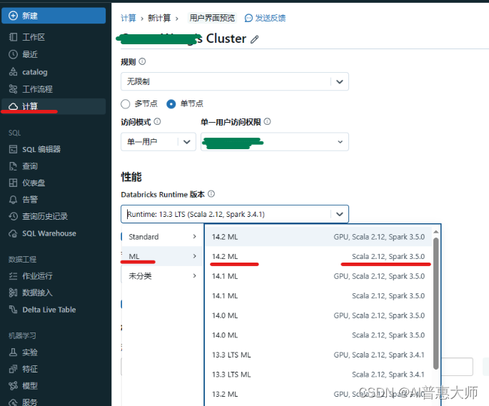 创建机器学习计算节点,注意:需要选择单一用户,单节点,Runtime选择ML 14.2ML Scala.2.12,spark3.5.0 ,不要选带GPU的。如下图: