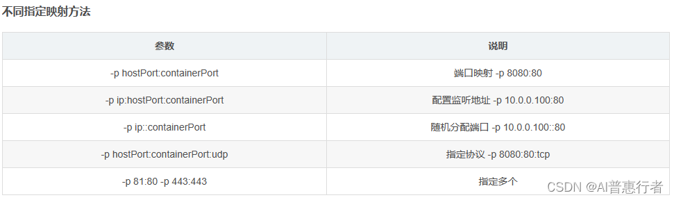 - -p:指定端口映射,格式为主机端口:容器端口。