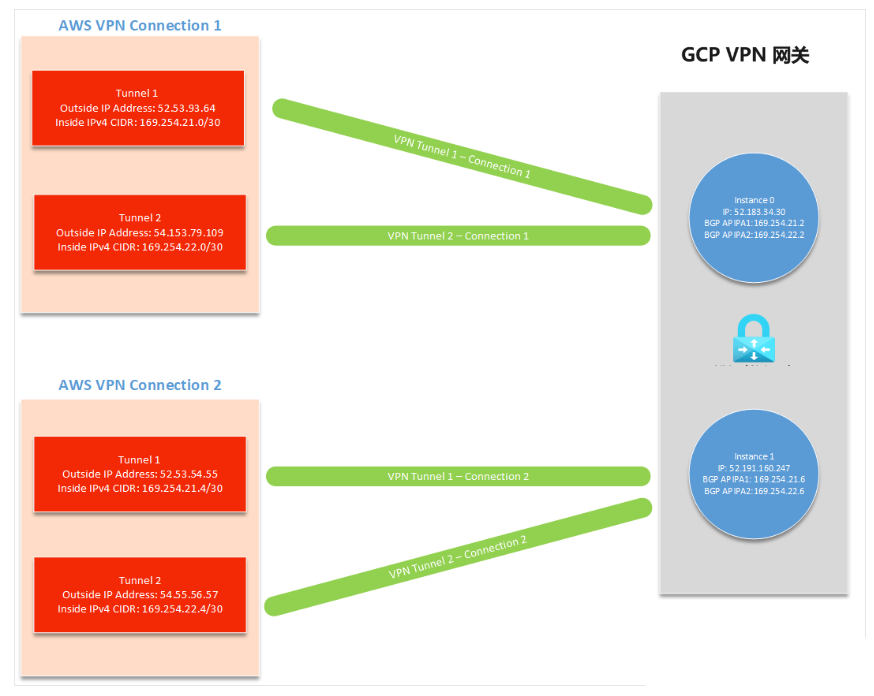 如果我们的业务环境既有AWS云又有GCP云,那么就需要将他们打通,最经济便捷的方式就是通过Site-to-Site VPN连接AWS和GCP云,你需要在两个云平台上分别配置VPN网关,并建立一个VPN隧道来安全地连接这两个环境,我们下面演示一个高可用场景下的S2S VPN线路构建,采用动态BGP协议的路由交换模式,整个过程稍微有些复杂繁琐,系统架构如下: