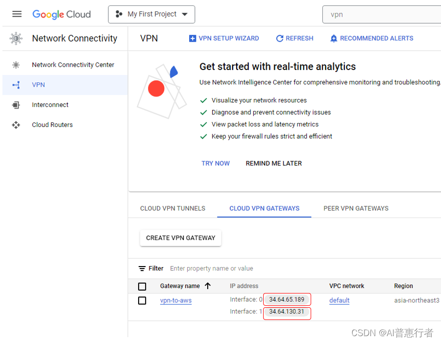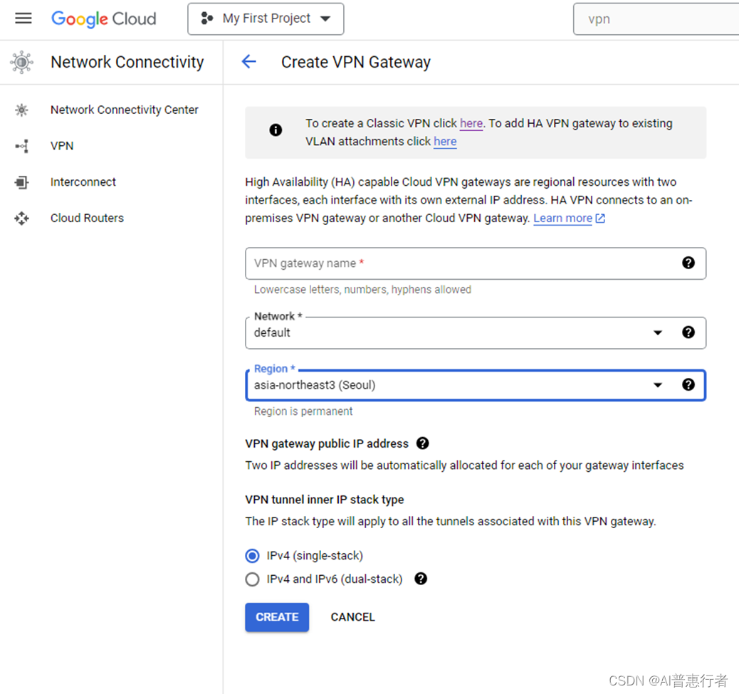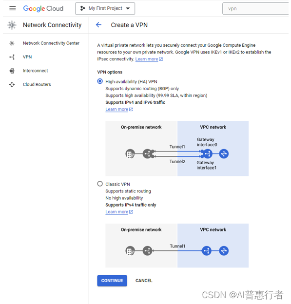 在GCP Console上选择VPN并创建VPN网关,如下图,选择高可用VPN