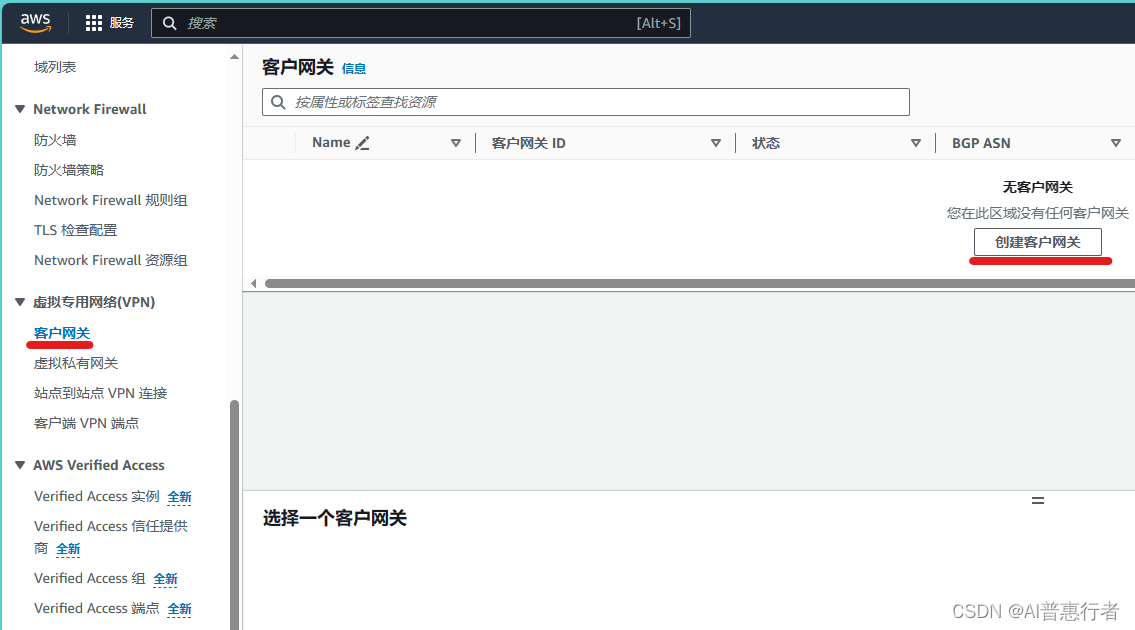客户网关代表你在GCP端的VPN设备。在VPC控制台中,选择“VPN Connections”部分下的“Customer Gateways”,然后点击“Create Customer Gateway”。输入GCP VPN网关的公网IP地址,并选择路由类型。