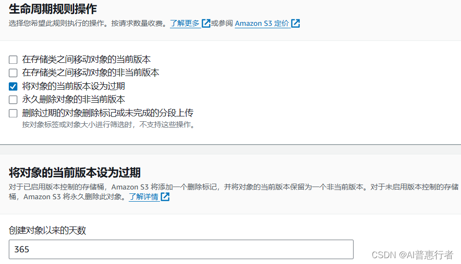 - 指定到期操作:设置对象何时过期。例如,你可以设置在对象创建后365天自动删除对象。
