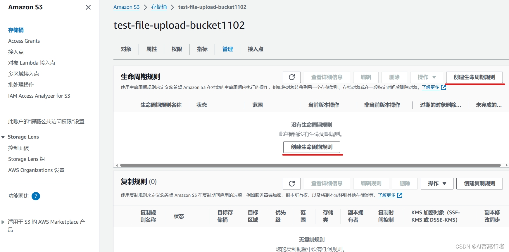 - 选择存储桶:在AWS管理控制台中选择你想要应用生命周期策略的S3存储桶。