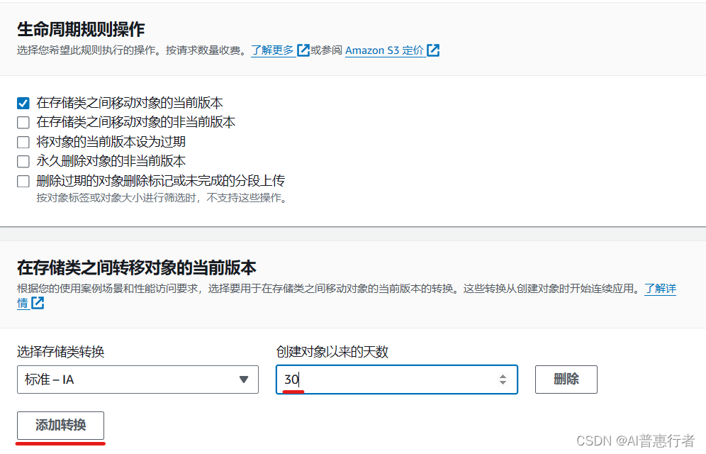 - 指定转换操作:设置何时将对象转移到另一个存储类别。例如,你可以配置规则在对象创建后30天将其转移到S3标准-IA存储类别。