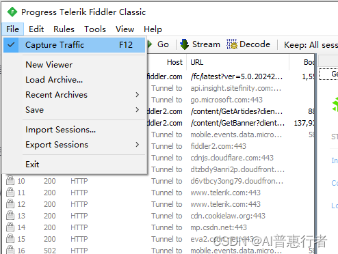 打开Fiddler后,默认情况下它会自动开始捕获流量。你可以在顶部工具栏找到“File”菜单下的“Capture Traffic”选项,勾选或取消勾选以控制流量的捕获。