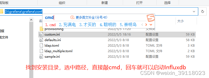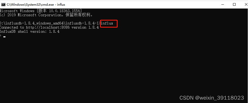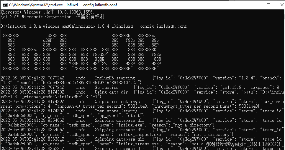 看到这个页面,就说明Influxdb服务启动成功了,这个页面不要关,重新打开一个cmd窗口,敲Influx命令