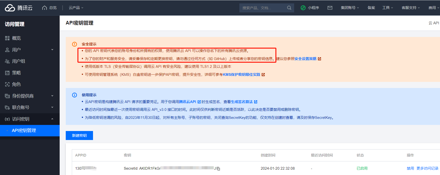 腾讯云 AK/SK 申请地址:腾讯云-API密钥管理,API 密钥代表用户的账号身份和所拥有的权限,使用腾讯云 API 可以操作用户名下的所有腾讯云资源,腾讯云给了很贴心的安全风险提示: