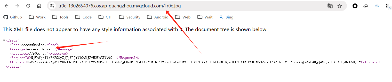 上传完文件,访问我的 COS 桶域名:https://tr0e-1302654076.cos.ap-guangzhou.myqcloud.com/ 以及 Tr0e.jpg 资源文件,可以看到是无权限访问“Access Denied.”,因为我刚才创建该 COS 桶的时候选择的是“私有读写”模式: