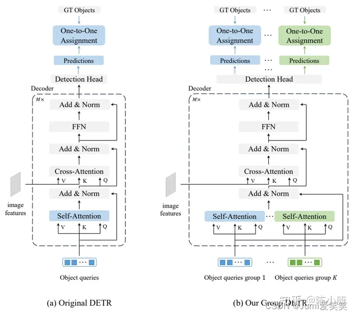 Group DETR 所以groupDETR提出的方法是在训练的时候用多组query,每组内仍然保持一对一匹配,推理的时候只用任意一组query就可以不用NMS了;1.如果增加query的数量,是可以提升检测性能的,但是计算开销也会增大,原因在于query个数越多,越容易命中目标;2.如果改成一对多的匹配,比如把一个gt匹配上2个positive box,可以加速收敛,提升一点性能;groupDETR要解决的问题是:既能够一对多的匹配,又能够不用NMS,节约计算开销;但是会导致使用的时候需要用到NMS;