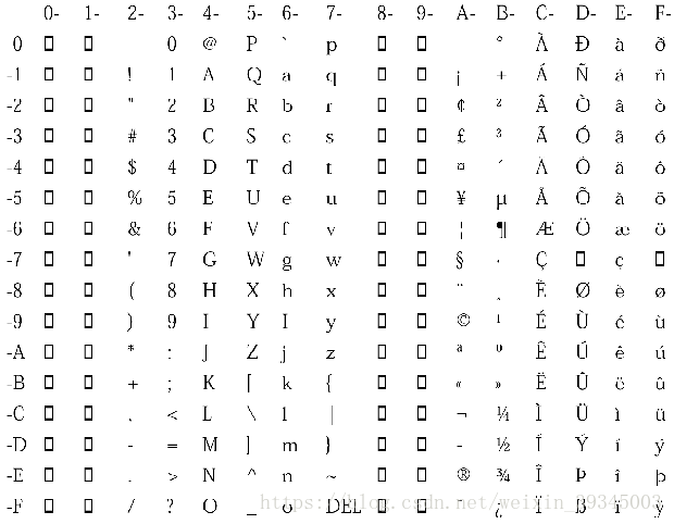 空方框表示该位置未定义字符。这与ANSI/ISO 8859-1的最终定义一致。ANSI/ISO 8859-1仅显示了图形字符,而没有控制字符,因此没有定义DEL。此外,代码0xA0定义为一个非断开的空格(这意味着在编排格式时,该字符不用于断开一行),代码0xAD是一个软连字符(表示除非在行尾断开单词时使用,否则不显示)。此外,ANSI/ISO 8859-1将代码0xD7定义为乘号(*),0xF7为除号(/)。Windows中的某些字体也定义了从0x80到0x9F的某些字符,但这些不是ANSI/ISO 8859-1标准的一部分。