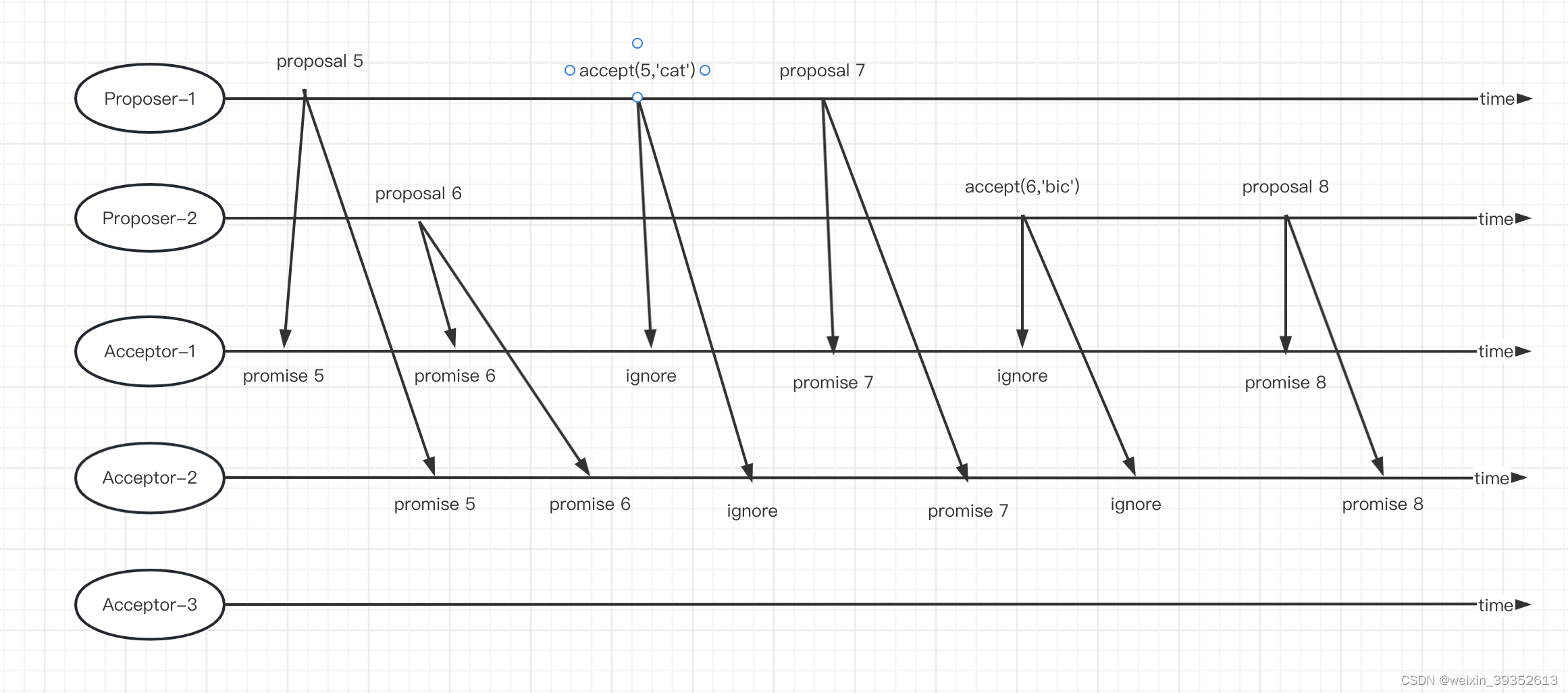 - A2返回promise(3,(2,'value2'));A2上次收到的最大序列号是P2的proposal-2,也就是2,2<3所以通过。这里的(2,'value2')是P2达成共识用到的accept(2,'value2') 。