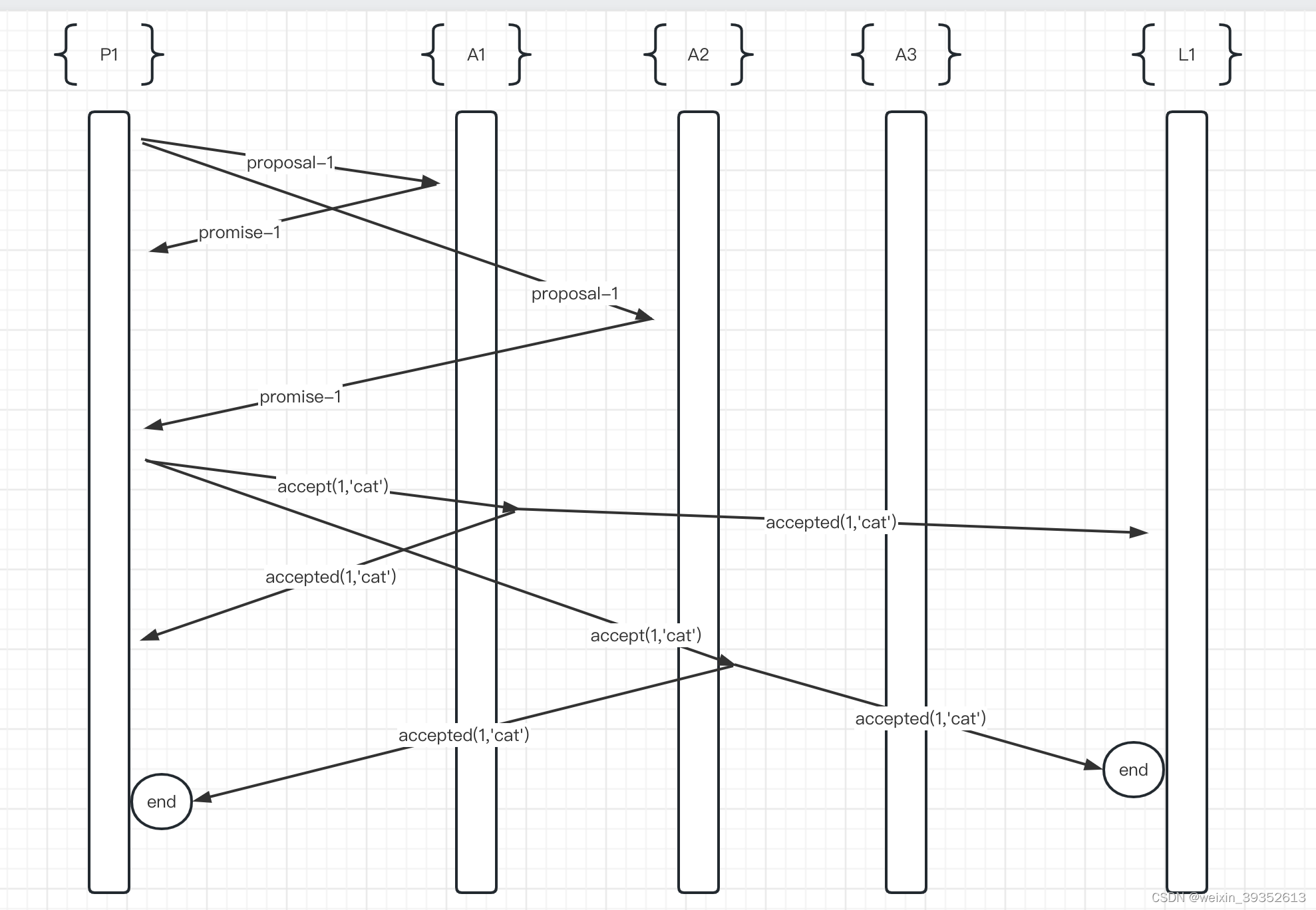 - 第四步:A1和A2收到accept(1,'cat')请求以后,A1和A2分别向P1和L1发送accepted(1,'cat')请求。此时流程结束,共识达成。