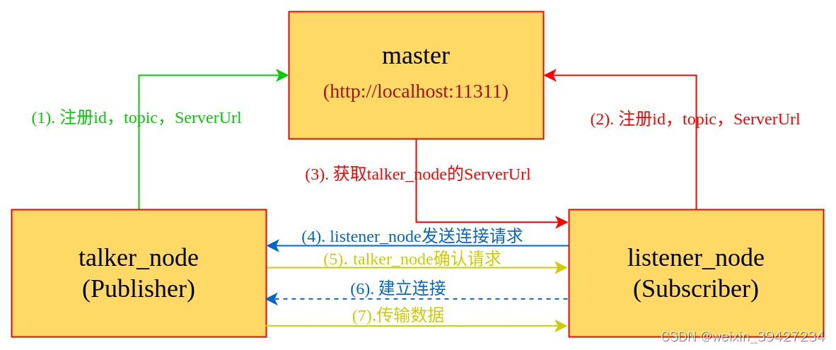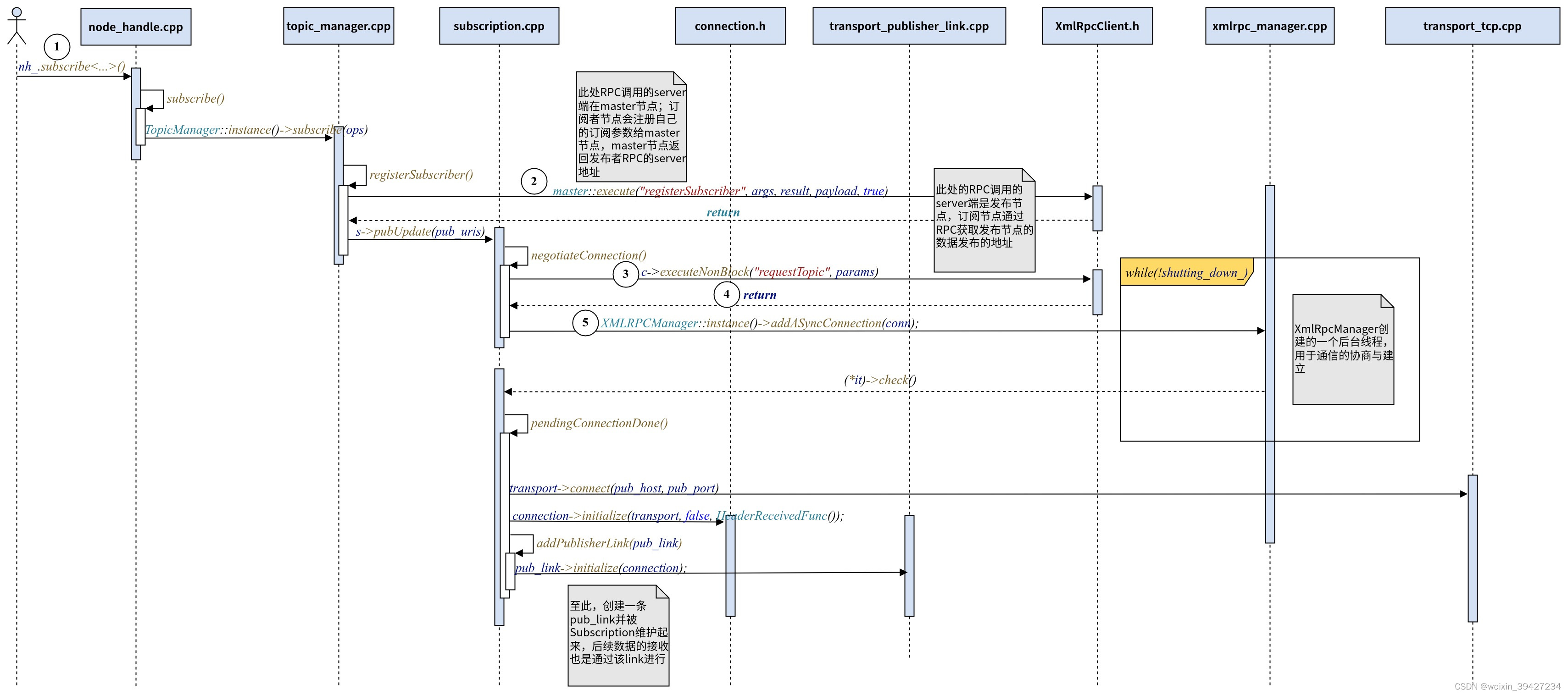 ROS1源码阅读 -- 建立连接 节点间进行数据传输的前提是建立连接,ROS中节点间创建连接主要通过XmlRpc向master节点注册节点信息和订阅者发布者信息;master节点会根据注册列表进行Publisher和Subcriber的匹配,并将匹配结果通过RPC client发送给对应节点。