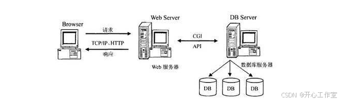 在早期,一些使用HTML语言编写的文件,再集合一些其它资源文件就可以组成一个最简单的Web程序,了解了Web程序也需要了解Web站点,它们之间的关系就是一个或者多个Web程序可以放在Internet上的一个Web站点(Web服务器)中进行使用。可以说Web应用程序的开发也带动了B/S这种网络结构模式的兴起。B是Brower(浏览器)的首字母,S是Server(服务器)的首字母,两个首字母进行组合就成了网络结构模式的简称B/S。由于这种结构模式通过安装在客户端的浏览器进行服务器的访问,可以把程序的核心功能安排在服务器中进行处理,给程序的开发,后期使用和维护省去了许多工作。图2.1展示的就是使用这种架构开发的程序的工作原理。
