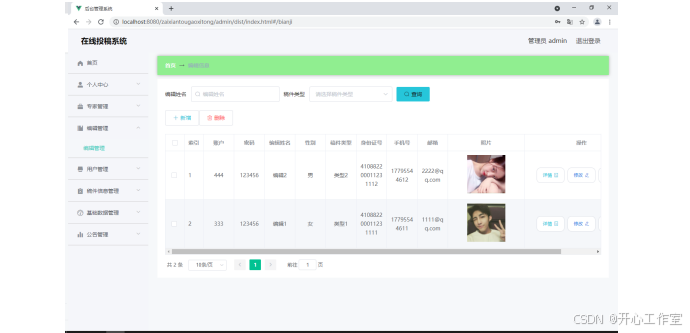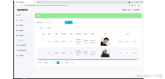 如图5.1显示的就是用户信息管理页面,此页面提供给管理员的功能有:用户信息的查询管理,可以删除用户信息、修改用户信息、新增用户信息,