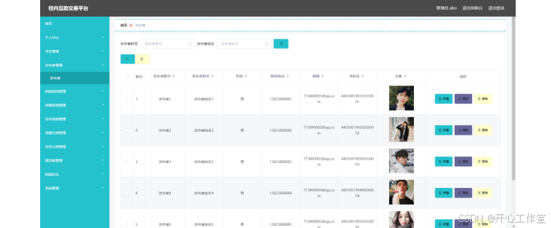 There are administrators, students and publishers on the mutual aid trading platform in our school. Administrator functions include personal center, student management, publisher management, campus information management, resource information management, task information management, resource classification management, task classification management, message board management, campus forum, system management, etc. Publisher functions include personal center, resource information management, task information management, resource purchase management and task receipt management. Student functions include personal center, resource purchase management and task collection management. Therefore, it has certain practicability.