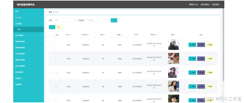 校内互助交易平台的系统管理员可以管理学生信息信息,可以对学生信息添加修改删除操作。具体界面的展示如图5.1所示。
