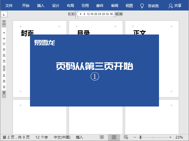 如何让页码从指定页开始显示?因为前面是封面和目录页,我们一般会让页码从正文页开始。所以,这里,我们作为演示,将页码从第三页开始。