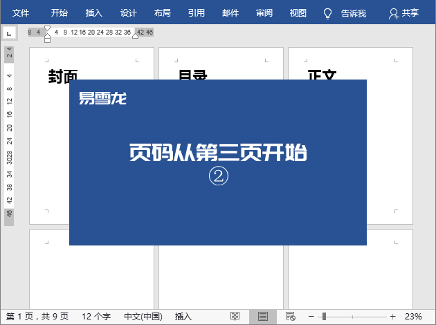 完成上面一步后,你可能会发现一些问题,总共是9页,而我们是从正文页开始计数的,所以按理说“共9页”应该要变成“共7页”才对,要减去封面和目录页。