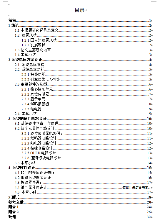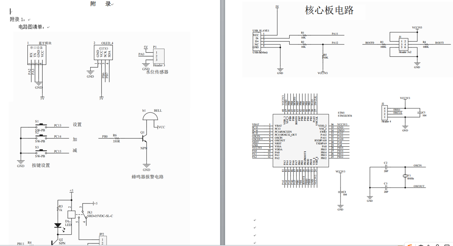 本系统主要以STM32F103C8T6单片机为主要核心部件组成,配合YW01液位传感器、OLED显示模块,按键模块,蜂鸣器,继电器来组成的整个报警系统。其主要功能主要在隧道内的水位超过一定值时,发出预警信号,以便防止更大的水灾发生。此功能主要依靠蜂鸣器来发出音频报警,继电器模拟隧道内水泵的打开状态,在水位到达一定值时,继电器控制开关打开,模拟隧道内水泵打开,产生排水功能。在此器件,蓝牙模块实时的将隧道内的水位数据及时传入终端,以便控制室的工作人员能更好的做出反应。
