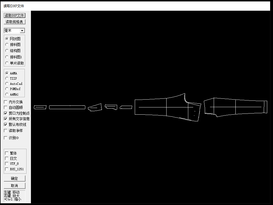 单片读取,这个是读取文件变形的终极大招。如果读取的文件网状图乱,用这个吧。此时裁片只可平移,基本不可做其它修改,只能用于排料。这个一般用来读取没有RUL文件的DXF变形后,再重读时用它。