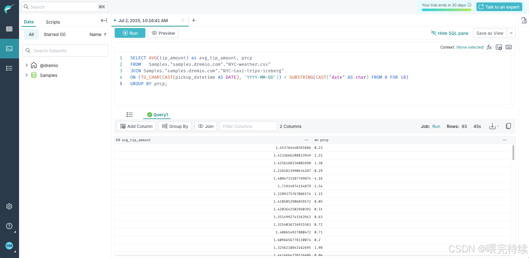 查询优化:Dremio的查询优化器能够自动识别查询模式并应用适当的加速策略。用户可以通过以下方式进一步优化查询性能: