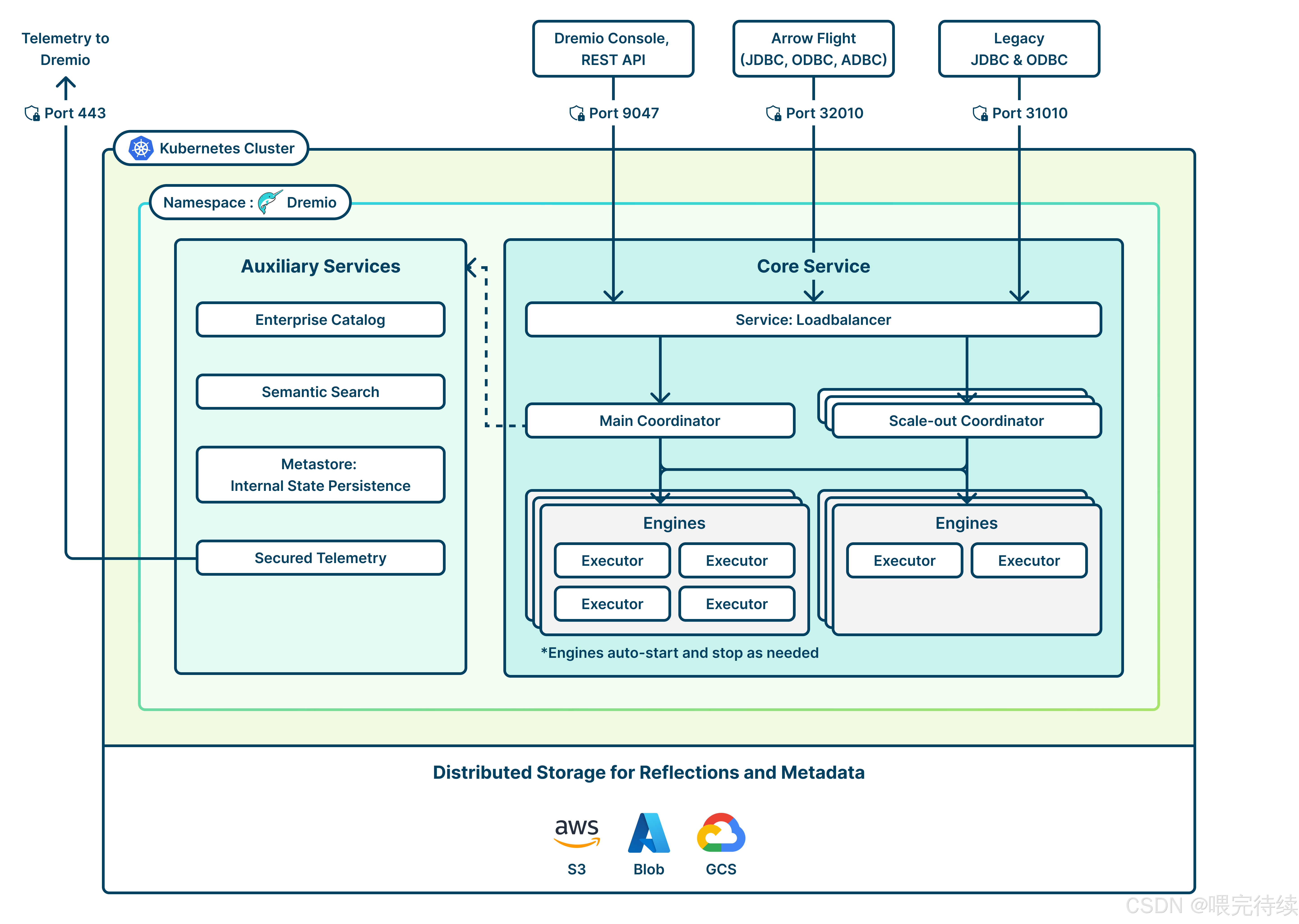 云原生弹性:Dremio基于Kubernetes的BYOC架构支持计算资源的动态扩缩容,使企业能够按需使用云资源,优化成本。在查询负载高峰期,Dremio可以自动扩展Compute Engine节点,确保查询性能;在低峰期则自动缩容,节省资源开销。