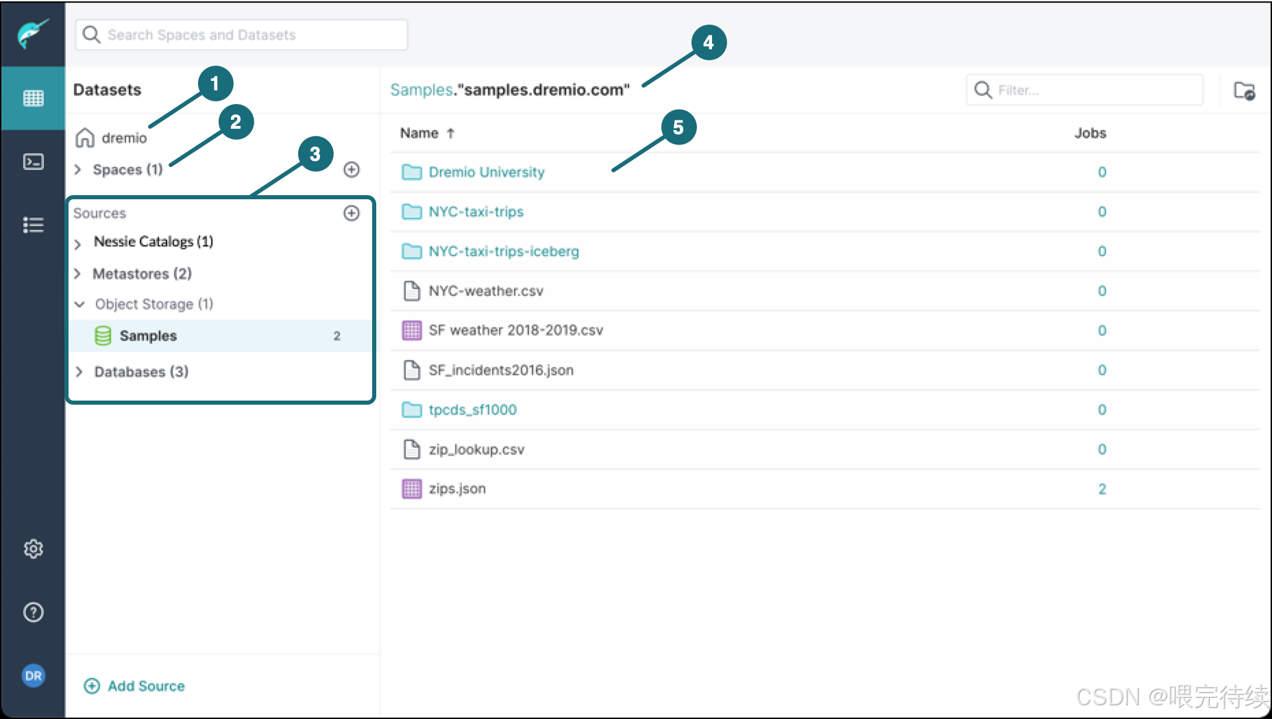 数据源连接:Dremio支持连接多种数据源,包括云存储、关系型数据库、NoSQL数据库和流数据源等。连接数据源的步骤如下: