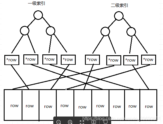 分为一级索引和二级索引,一级索引的叶子节点存储的就是数据(row),二级索引的叶子节点存储的是主键