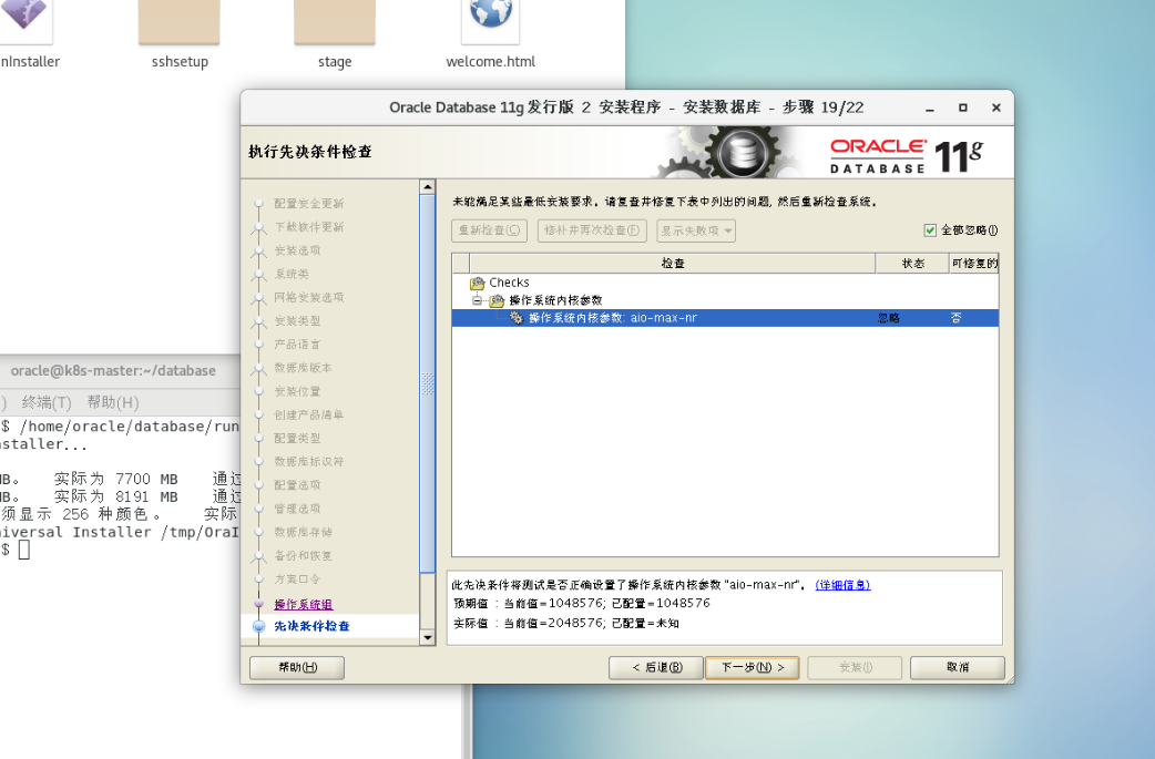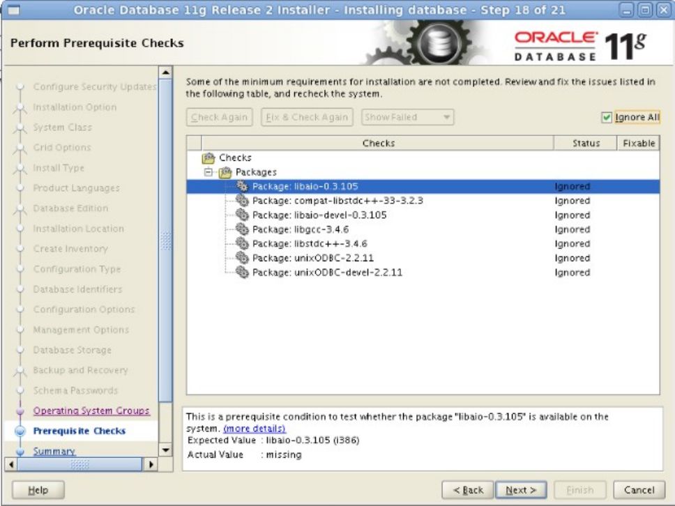 图-19 安装程序对环境进行检查,由于CentOS的32bit程序包都是i686的,而oracle要求i386,所以此处会失败,忽略即可。点击next
